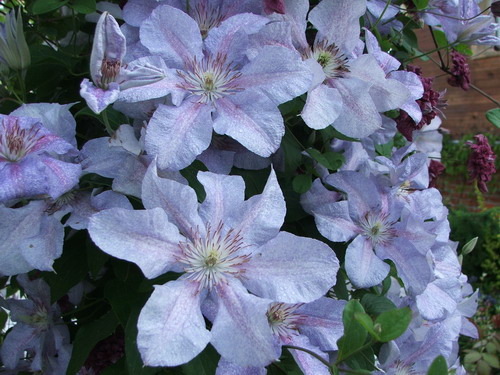 Клематис Teksa - сорт со светлыми голубовато-фиолетовыми цветками и светлой розоватой полоской по середине лепестка, с белыми, мелкими пятнышками. Цветки диаметром около 15 cм, сложены из 6 лепестков со слегка волнистыми и рифлёными краями. Тычинки со светло-пурпурными пыльниками на белых нитках. Цветёт обильно на побегах этого года в июне-июле и сентябре. Цепляется за опоры листовыми черешками. Хорош для выращивания у ограждений, решёток, сеток, беседок и других садовых опор. Высота растения достигает 2,5 м. Сорт морозостойкий.