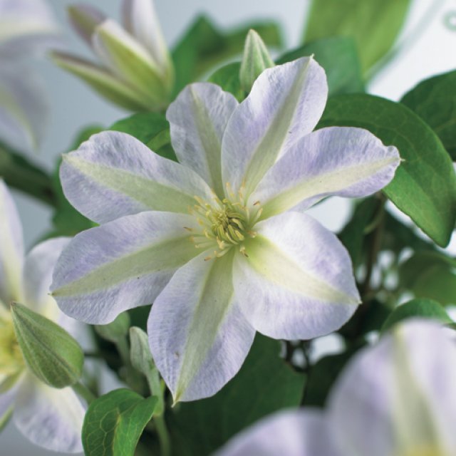 Саженцы клематиса Yukikomachi привлекают невероятной элегантностью и утонченностью, свойственной японским сортам – этой декоративной лиане удается передать восточную красоту страны Восходящего Солнца. Диаметр обильно растущих бело-фиолетовых цветов с белой полосой по центру лепестка составляет 7-12 см. Саженцы этого сорта можно садить в любом месте участка – они крайне неприхотливые и очень устойчивы к любым негативным факторам. Особенно стоит отметить стойкость к любым болезням.Крупномер Yukikomachi вырастает до 2-2,5 м, поэтому вы можете использовать его для вертикального озеленения беседок, арок и других садовых опор. Также этот сорт хорошо растет в контейнерах.