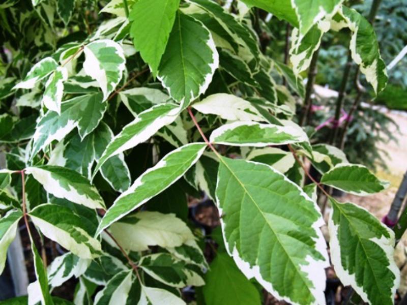 Клен Variegatum - кустарник, высотой 2.5-3 м и шириной 2-3 м- ассиметричная округлая форма кроны- быстрорастущее, 40-60 см в год. Цветы невзрачные, двудомные. Плоды малопривлекательные. Листья непарноперистые, 3-5 листочков, светло-зеленые с белыми пятнами, желтовато-зеленые зимой. Корневая система поверхностная, медленнорастущая, относительно чувствительная.