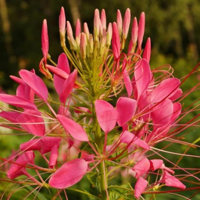 Однолетнее полукустарниковое растения высотой 90-150 см. Цветки густо-розовая, очень своеобразные, похожие на паучка - четыре лепестка венчика расположены с одной стороны цветка, а с другой - тонкие и длинные тычинки и столбик. Цветки собраны в конечную многоцветковую кисть, распускаются снизу вверх и кисть при этом постепенно вытягивается. Из отцветших цветков образуются направленные в стороны вытянутые коробочки на длинных плодоножках. Растение свето- и теплолюбивое, засухоустойчивое, не переносит застоя воды. Размножают семенами, которые высевают на рассаду весной (нужна стратификация при t 4°C) или в открытый грунт под зиму. Всходы появляются через две недели. Уход состоит в регулярных прополках, рыхлениях, подкормках, а в засушливое лето и поливах. Клеома-очень эффектное растение, сразу приковывает к себе взгляд, даже если его высаживают на заднем плане большого цветника. Однако лучше всего смотрится в небольшой группе или одиночно среди более низкорослых цветов или зеленого газона. В срезке стоит более 10 дней, рекомендуется для оригинальных цветочных композиций.
