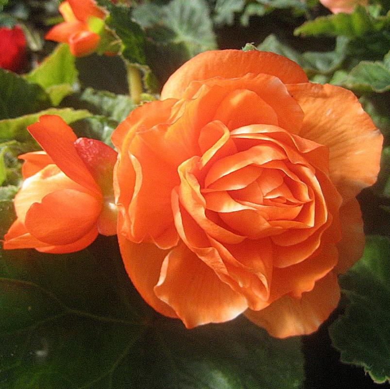 Бегония махровая Ориндж - куст высотой 35 см, компактный, с прямостоячими стеблями, листья зеленые, сердцеобразные с неровно-зубчатыми краями. Соцветие крупное, махровое, ароматное, диаметром до 10 см. Лепестки короткие, овальные, оранжевого цвета. Цветет в июне-октябре. Используется на клумбах, рабатках, в групповых посадках, для озеленения балкона или помещения как горшечная культура. Клубни бегонии рекомендуется выкапывать осенью и хранить во влажном песке или торфе. Предпочитает тепло и влагу, но не терпит переувлажнения.