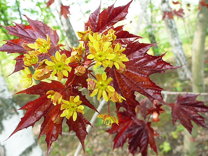 Саженцы клена остролистного Crimson King – отличный способ оформления для разных участков и территорий.Вырастает до 20 м. Для кроны характерна пышность. Листья обладают при распускании кроваво-красным оттенком, который в дальнейшем становится темно-пурпурным, а осенью – фиолетовым.Плоды-крылатки имеют красный цвет.Цветки появляются вместе с листьями, поэтому их желто-оранжевый окрас хорошо сочетается с цветом листвы.Среди плюсов стоит выделить неприхотливость клена остролистного Crimson King его быстрое разрастание, а также стойкость к засухе.