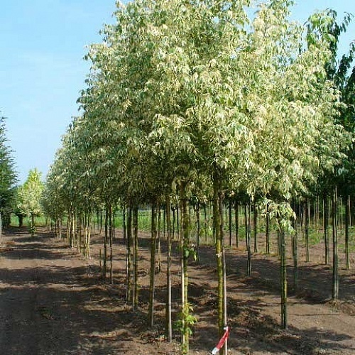 Цветки, из которых появляются семена-крылатки, небольшие – до 6 мм, желто-зеленые. Листья ланцетные, пяти- или семилопастные, как у клена канадского, длиной в 10-20 см, весной они розового цвета, летом становятся пестрыми – бело-зелеными. К осени приобретают пестрый бело-желтый цвет.