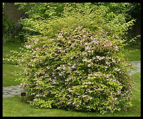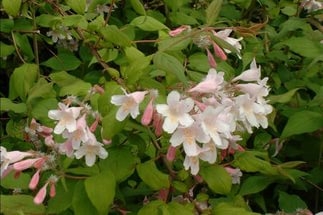 Цветки колокольчатые, длиной до 2 см, бледно-розовый. Чашечки опушенные, оставшиеся на кусте после цветения. Куст цветет очень обильно, во второй половине мая.