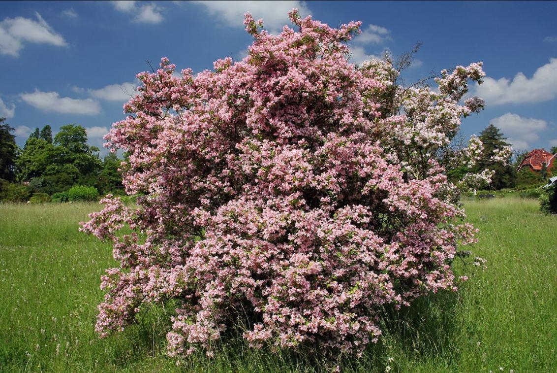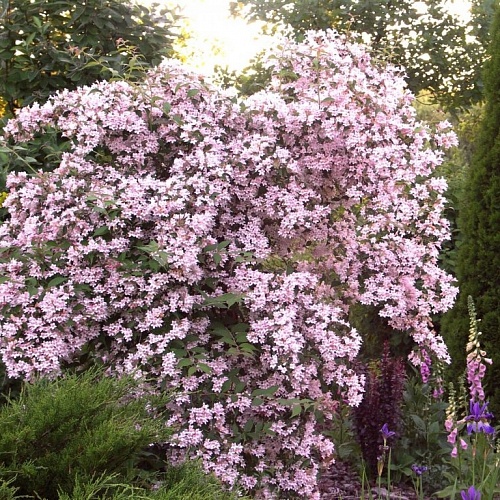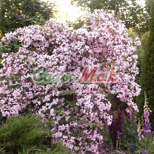 Саженцы кольквиция представляют собой красивейший декоративный кустарник. Он украсит любой сад крупными и ароматными соцветиями, которые окрашиваются в беловато-розовые тона. Такие цветы придают любой садовой композиции очарование и воздушность. В высоту она может достигать двух метров, хорошо поддается обрезке, благодаря чему ей можно придать любую форму. Во время цветения верхушка куста полностью покрывается бутонами нежного цвета, осенью листва растения становится яркой оранжевой. Этот сорт любит солнечные места, защищенные от сквозняка и ветра, отличается повышенной зимостойкостью.