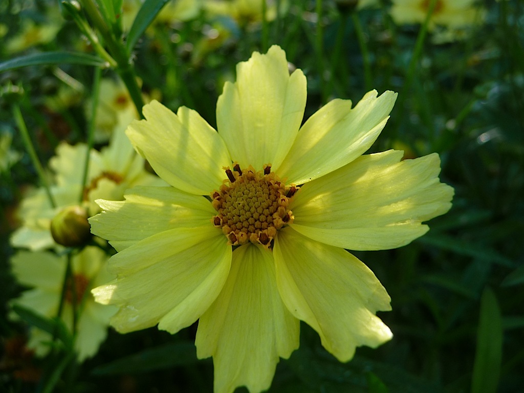 Кореопсис мутовчатый Мунбим (Moonbeam) достигает 30-40 см в высоту и 50 см в диаметре. Темпами роста не отличается. Цветки бледные, кремово-желтые, с сероватым подтоном. Середина желтовато-бежевая или темно-желтая. Диаметр цветков – около 3 см. Лепестки округлые и узкие, немного длиннее, чем у иных сортов.