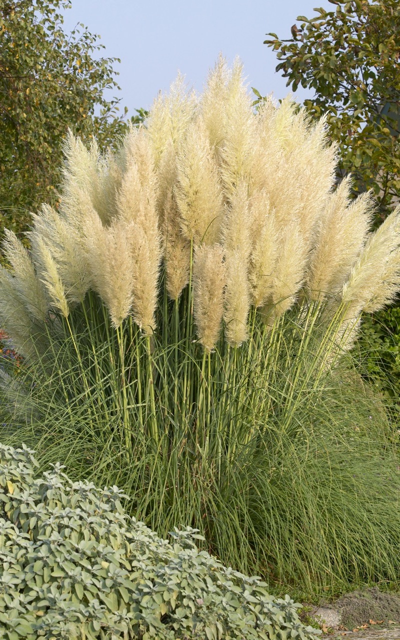 Кортадерия (пампасная трава) Пумила – эффектное многолетнее растение с оригинальными широкими метелками снежно-белой окраски. Растение формирует прикорневую розетку из сизо-зеленых удлиненных листьев, имеющих зубчики по краю листовой пластинки. Высокие, до 3 м, пышные султаны белого цвета отрастают из центра прикорневой розетки. Период декоративности продолжается с августа по сентябрь.