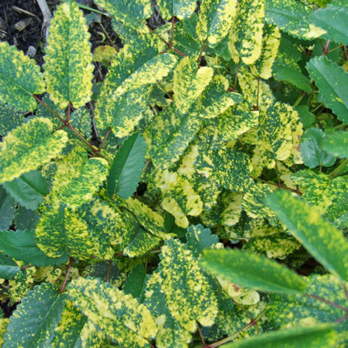 Зубчатые, блестящие, вариегатные листья: на зелёном фоне неравномерный лимонно-жёлтый крап.