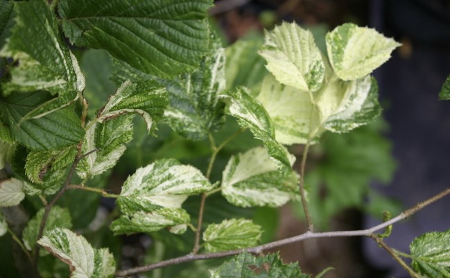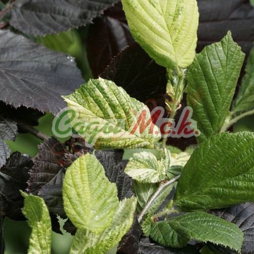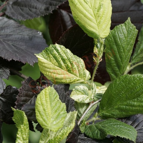 Листья 5-12 см длиной и шириной 9 см, округлые, заостренные на вершине и сердцевидные у основания, зубчатые. Молодые листья пурпурные, старые-зеленые с белыми или желтыми, окраской пятнами или полосами, некоторые полностью зеленые.