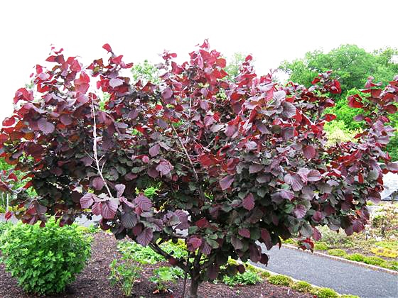 Декоративная лещина. Куст высотой и шириной 2-3 м. Растёт медленно. В штамбовой форме высота зависит от места прививки. Крона густая. Листья длиной 5-12 с м и шириной 9 см. Молодые листья тёмно-багровые, более старые тёмно-зелёные. Серёжки пурпурные. Цветение раннее, до распускания листьев. К почве нетребовательна, место солнечное или полутенистое. Морозостойкость до -26ºС.