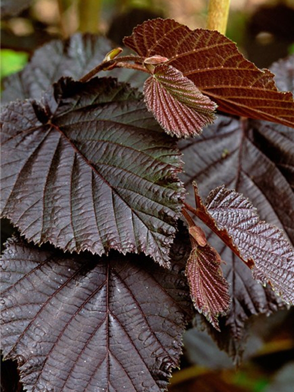 Высота до 5 м. Крупный развесистый, многоствольный кустарник. Побеги вертикальные, быстрорастущие, с серовато-коричневой корой. Листья крупные, широкоовальные, с четким жилкованием и крупными зубцами по краю, шероховатые, при распускании темно-пурпурные или красно-коричневые. Нижняя сторона листа опушенная и светлее, чем верхняя. Летом листья становятся зелеными с красновато-коричневым оттенком. Цветет рано весной до распускания листьев. Мужские сережки крупные, бордовые, женские цветки - неприметные, в виде почек на верхушках побегов. Из них развиваются плоды - орехи, крупные, съедобные, бордовые с красно-бордовыми листовидными плюсками - обертками. Созревают в конце августа-сентябре