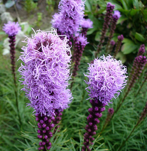Лиатрис Floristan Violett - многолетнее растение. Листья зеленого цвета, по форме узкие и длинные. Период цветения приходится на июнь-август. Цветы имеют фиолетовый окрас и густо расположены на верхушках стебля.