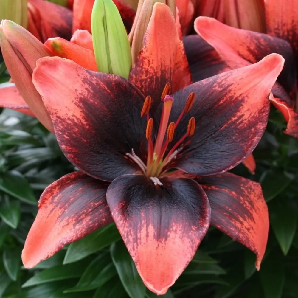 Лилия Tiny Shadow (Тайни Шэдоу) распускается ранним летом и идеально подходит для культивирования в контейнерах. Также она будет хорошо выглядеть на краях клумб и в альпинариях. Полезна и в букетах. Цветет в среднем на 5 дней позже, чем самая ранняя из лилий серии Tiny Series, но вы все равно увидите это цветение в начале июля. Совершенные, звездообразные лепестки притягивают взоры окружающих. Стебель высотой 30-40 см. Он заканчивается букетом крупных цветов. Лилия азиатская горшечнаяТайни Шэдоу - пыльники рыжего цвета, создают дополнительный контраст. Вертикальные стебли выложены глянцево-зелеными, узкими листьями в форме копья. Цветы распускаются через 60-70 дней после посадки (к летнему солнцестоянию). Морозостойкость высокая. Лилия Tiny Shadow будет радовать вас из года в год!