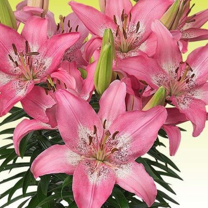 Лилия азиатская горшечная Тренди Никосия - это сорт с очень нежными цветками карамельно-розового оттенка и белой серединкой, на фоне которой ярко выделяются бордовые тычинки и такого же цвета брызги по центру. Цветет Лилия азиатская горшечная Тренди Никосия в конце июня - первой половине июля.