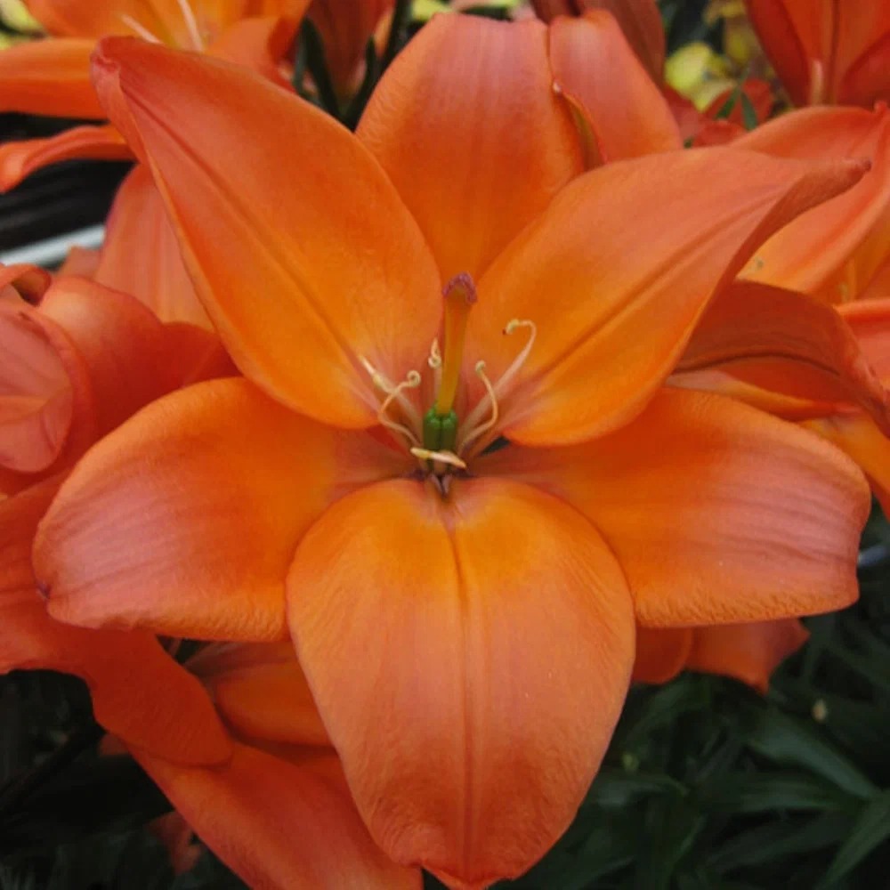 - Характеристики ярко-оранжевый, лепестки красивой формы, с занутыми вниз краями, диаметр цветка 17 см, без пыльцы