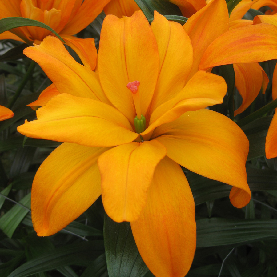 Луковицы Лилии азиатской махровой Скубиду (Lilium asiatic Sundew) относятся к «радостным» сортам, украшающим палисадник яркими солнечными пятнами. На цветоносе, достигать в высоту до 110 см, распускаются крупные (около 15 см), яркие желто-оранжевые соцветия. Отличие сорта в не очень широких лепестках, что добавляет цветкам изящества и утонченности. Скубиду порадует продолжительным цветением, если выделить ей на участке солнечное место и защитить от сильного ветра и подтопления. Лилия азиатская махровая Скубиду морозостойкий сорт и неприхотливый в уходе.