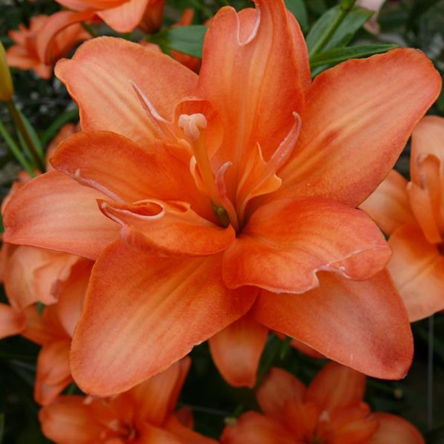 Лилия азиатская махровая Строберри Ванилла (Lilium) не останется незамеченными у настоящих почитателей лилий. Сочно-апельсиновые цветы не часто встречаются на загородных участках, но именно этот насыщенный цвет создает контраст в саду и поднимает настроение. Каждый лепесток с яркой оранжево-красной окраской как будто покрашен кистью художника, причем центр у лепестков более светлый. Особенно стоит отметить листву Лилии азиатской махровой Строберри Ванилла нежного зелено-травяного цвета с салатовыми переходами.