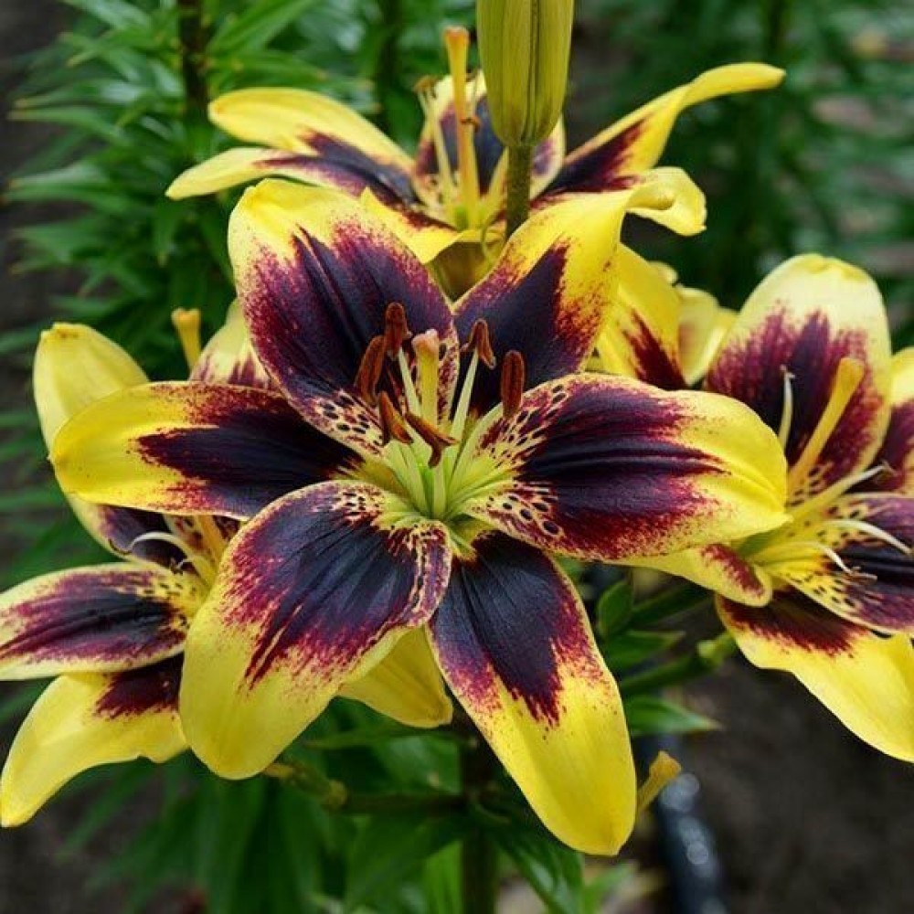 Лилия азиатская Пьетон – цветок яркий желтый с большими темно-бордовыми пятнами у основания лепестков, диаметр цветка 13 см. Посадку луковиц производят весной (после окончания заморозков) или ранней осенью. Почву предпочитают хорошо дренированную, рыхлую, богатую минеральными веществами. Полив следует сделать умеренным, излишняя влага для Лилии азиатской Пьетон губительна. На зиму перед наступлением холодов лилии укрывают листьями и травой.
