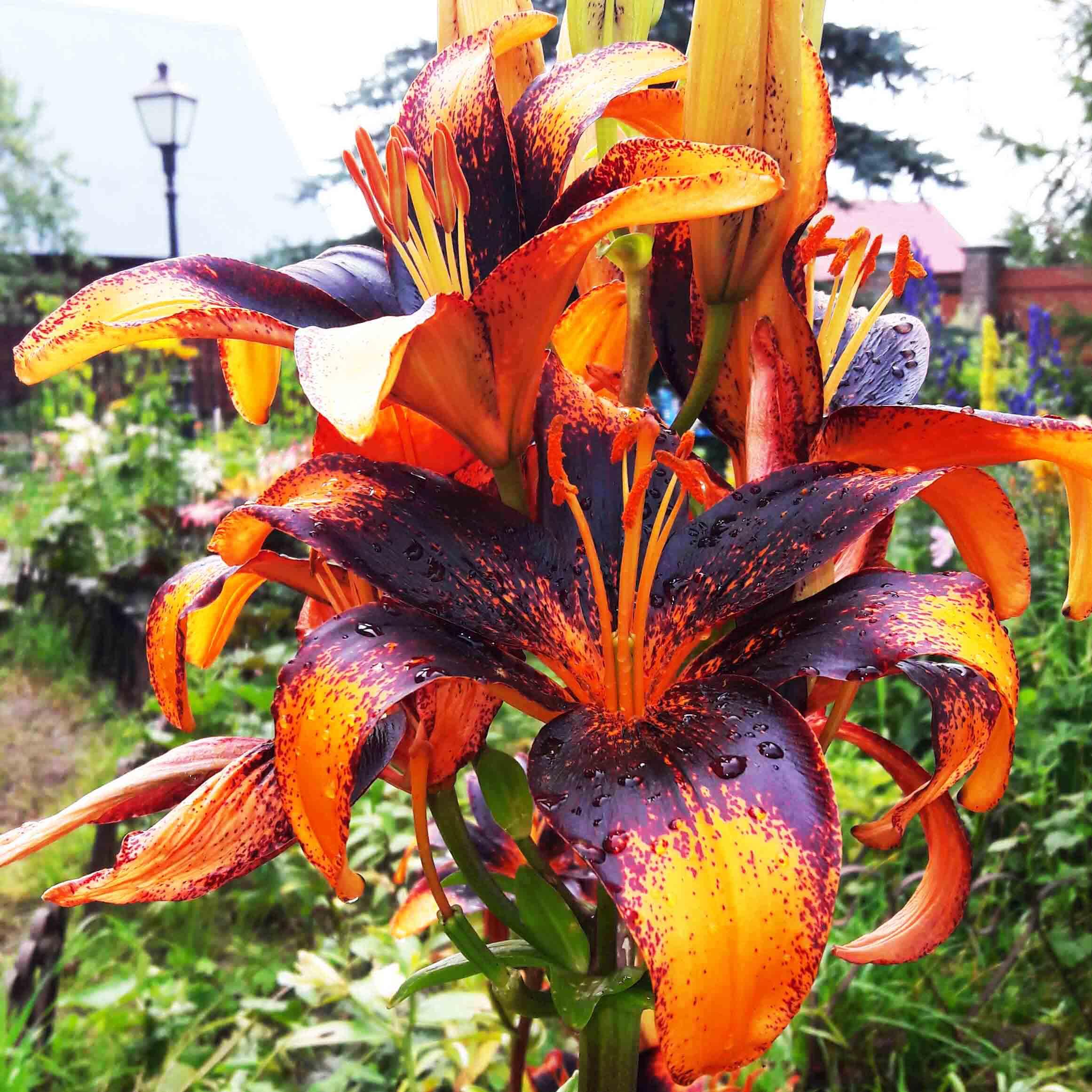 Луковицы Лилии азиатской Танго Париж Харт (Lilium asiatic Paris Heart) удивляют тигровой окраской раскрывающихся цветков. Темно-фиолетовый цвет в центре цветка контрастирует с ярко-оранжевыми кончиками лепестков. Оттенки плавно переходят из одного в другой, благодаря рассеянному темному крапу. На одном цветоносе вы не найдете ни одного одинакового цветка, природа будто раскрашивает каждый из них по отдельности. Цветение продолжительное, начинается во второй половине июня. Лилия азиатская Танго Париж Харт пригодна для выгонки вне сезона.