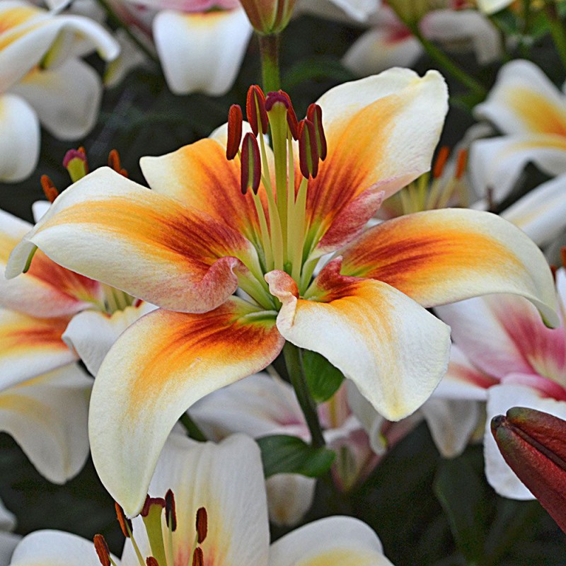 Лилия Tinos - многолетнее луковичное растение с прямыми и крепкими сильно облиственными стеблями. Цветки диаметром до 16 см, чашевидные, бело кремовые с двухцветным пятном на каждом лепестке: оранжево-жёлтым в середине и малиново-красно-оранжевым у основания. Соцветия состоят из 6-7 направленных вверх цветков. Высота растения 100-130 см. Очень морозостойкий и неприхотливый сорт. Период цветения - июль.