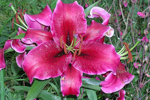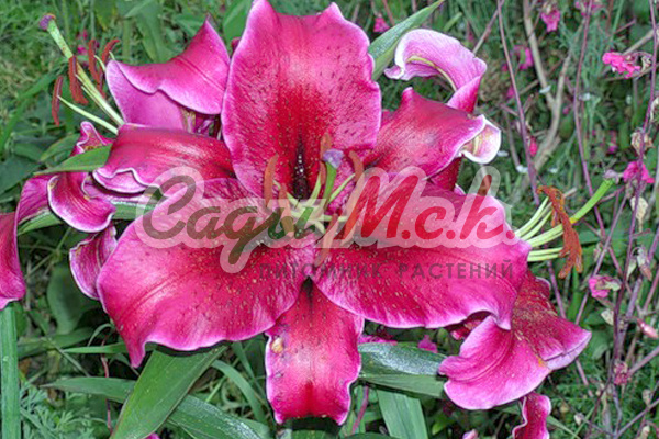 Лилия Cobra – ароматный восточный гибрид с яркими и крупными цветами. Цветы широко раскрываются и достигают диаметра 25 см, края лепестков отогнуты наружу. Цветок темно-розовый, красный, темно- малиновый, обрамленный белым тонким кантом по краешку каждого лепестка. Середина усыпана темным крапом. Высота лилий этого сорта, как правило, не превышает 110 см. Цветет с июля по сентябрь, распространяя вокруг себя стойкий сладкий аромат.