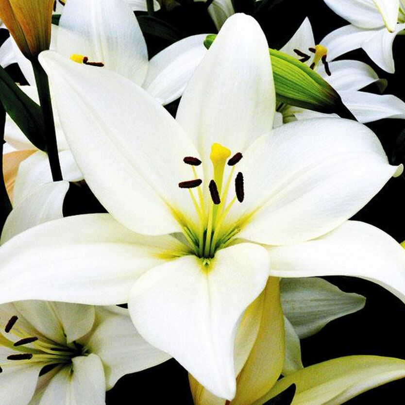 Лилия ЛА-гибрид Брайт Даймонд (Lilium) окажется настоящим бриллиантом в ожерелье вашего цветника. Впрочем, даже название этого голландского гибрида можно перевести как «Яркий алмаз». Среди своих собратьев разновидность отличается удивительно чистым, белым цветом лепестков, на фоне которых выделяются крупные чёрные пыльники.
