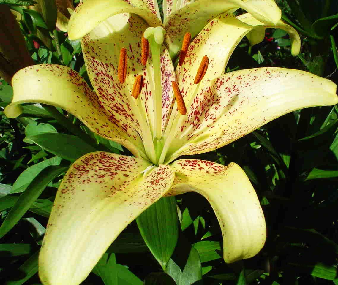 Лилия Санкрест ЛА-гибрид - цветок крупный, желтый с бордовым напылением из крапа по всей длине лепестков. Лилии любят песчано-глинистую с хвойным опадом, кислую, рыхлую, хорошо дренированную почву. Посадку луковиц производят весной (после окончания заморозков) или ранней осенью. Перед посадкой Лилии ЛА-гибрида Санкрест необходимо обработать луковицы в слабом марганцевом растворе. Полив умеренный (не стоит заливать растение), после цветения полив сократить.