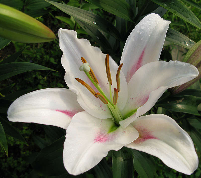 Лилия Nuance - гибрид. Цветок огромный с приятным ароматом, белого цвета с нежно-розовой короной в центре. Высота взрослого растения - 110 см, диаметр цветка - 25 см.