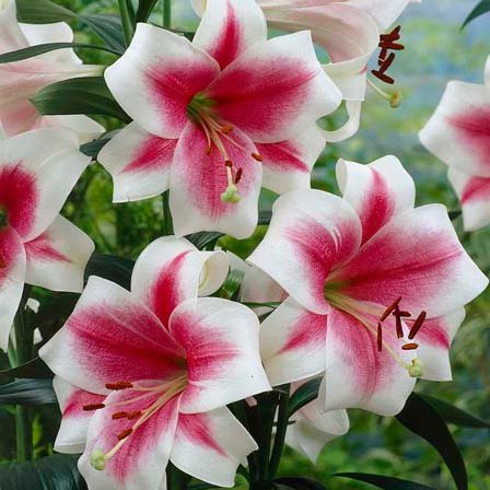 Лилия Triumphator - очень эффектная лилия с крупными цветами, размером 20-25 см. Цветение обильное и длительное - июль, август, сентябрь. Лепестки широкие, нежные, слегка закручены, белоснежные, с насыщенным, малиново-розовым центром. Лилия излучает тонкий, сладкий, душистый аромат. На прочном стебле обильно расположены листья темно-зеленого оттенка. На самой макушке стебля образуется до 15 бутонов цветков. Высота растения - 90-100 см.