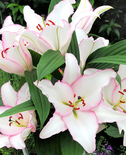 Луковицы лилии восточной Милессимо (Lilium hybrid oriental Milessimo) — это изысканное сочетание благородных оттенков. Украшением этого сорта становятся крупные (до 22 см в диаметре) светлые цветы, которые распускаются в конце лета и распространяют сильный аромат. Лепестки белого цвета, а на их краях находится тонкая лиловая кайма. Благодаря ажурной окантовке и темным контрастным пыльникам букеты из этих цветов выглядят особенно пышными и воздушными. Лилия Милессимо может расти в открытом грунте круглый год. Она устойчива к жаре и заморозкам, обильно цветет на солнечных участках и в полутени. Также Лилия восточная Милессимо подходит для среза — благодаря высоким (до 110 см), крепким стеблям и надежным соцветиям, долго хранится и не увядает.