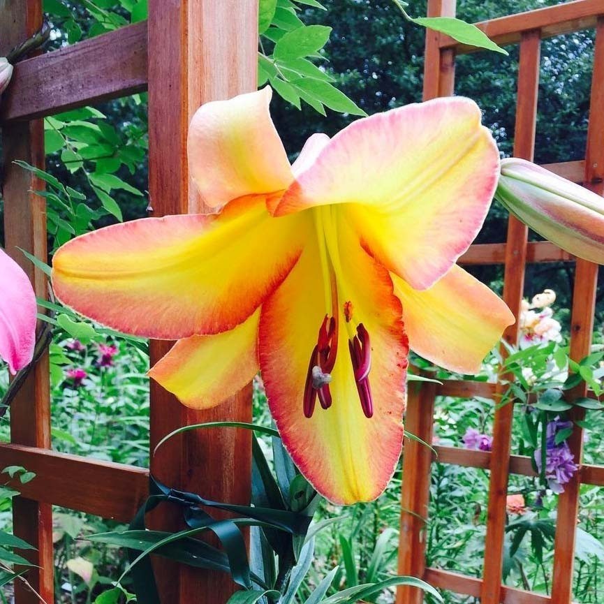 - Характеристики КРУПНЫЙ, желтый с палево-розовой каймой и темными пыльниками, диаметр цветка 22 см