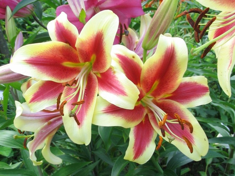 Лилия Shocking - цветки очень крупные, достигают 21 см в диаметре. Окрас лепестков желтый с красными мазками вдоль. Цветение приходит на июнь-июль. Высота растения достигает 120 см.