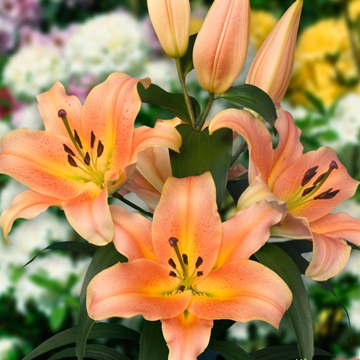 Луковицы лилии ОТ-гибрид Зелмира (Lilium OT-Hybrid Zelmira) — один из наиболее элегантных сортов. Уже в июле на высоких цветоносах (до 120 см) появляется одновременно много цветков (на отдельных кустах — до 30 штук), которые достигают 25 см в диаметре. Лепестки матовые, окрашены в светлый персиковый оттенок с плавным переходом к яркому лососевому в центре. Цвет классический и создает правильные акценты в композициях, но не менее эффектно смотрится и в отдельности. Лилия Зелмира — один из самых популярных и узнаваемых сортов. Он особенно ценится благодаря простоте в уходе. Цветы могут расти на одном месте до 4–5 лет в условиях регулярного добавления минеральных подкормок. На зиму Лилия ОТ-гибрид Зелмира нуждается в укрытии и хорошо переносит морозы в открытом грунте.