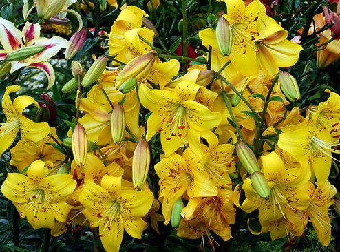 Лилия Pearl Jennifer - энергичный, огромный цветок диаметром до 16 см, со слегка отогнутыми лепестками, богатого канареечно-желтого цвета с частыми красновато коричневыми крапинками. Лилия развивается из одной луковицы и имеет один сильный стебель, на верхушке которого распускаются цветы. Зацветают цветки в конце июня – начале июля, срезанные лилии долго сохраняются в вазе.