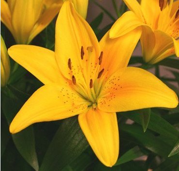 Лилия Tiny Bee - карликовый, луковичный многолетник с крепкими, прямостоячими стеблями и спирально-образно расположенными листьями. Листья большие, ланс-образной формы, блестящие, темно - зеленые. Цветки, диаметром 16 см, канареечно-ярко-жёлтые с редким мелким коричневым крапом вокруг центра. Высота растения - 45-50 см. Период цветения - июнь-июль.