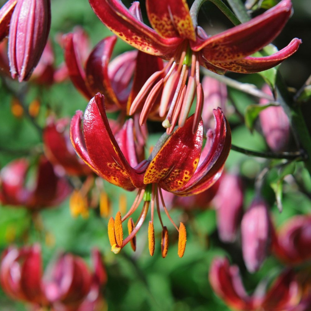 Видовая лилия Клод Шрайд формирует гладкие стебли высотой около 100 сантиметров, на которых распускается несколько цветов. Цветет в июне и августе. Соцветия имеют красный оттенок и золотистые пятна. Многолетник любит песчаную, супесчаную и суглинистую дренированную почву нейтральной реакции. Сорт хорошо растет на солнечных или полузатененных участках. Помимо полива, уход включает в себя прополку, фосфорные подкормки и борьбу с вредителями. Во второй половине лета почву рекомендуют поддерживать слегка увлажненной. Видовая лилия морозостойка, поэтому не требует укрытия на зиму. Лилия видовая Клод Шрайд подойдет для групповых посадок. Хорошо будет смотреться на фоне папоротника или можжевельника.