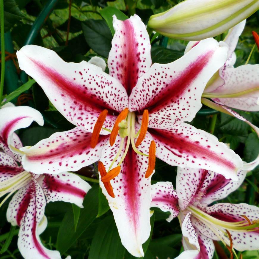 Лилия Dizzy - обладательница обворожительного аромата. Время цветения приходится на июль, даря нам крупные бутоны белоснежного оттенка. Лепестки лилии этого сорта украшены широкой ярко-розовой полоской по середине и густыми бордовыми веснушками по всей ширине лепестка. Цветы отличаются не только ярким окрасом, но и крупным размером. Диаметр цветов при роспуске достигает 15-20 см. Цветение очень длительное. Высота растения достигает 90-100 см, на прочном стебле густо размещены темно-зеленые узкие листья. Лилия идеальна как для высадки на любых видах клумб, так и выращивании на срезку. Сорт в срезке устойчив, что прекрасно подходит как и для любой хозяйки так и для флористов.