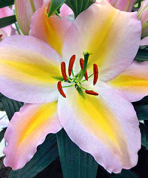Луковицы лилии восточной Фокус Покус (Lilium hybrid oriental Hocus Pocus) подойдут для создания пышных цветочных композиций и букетов. Этот сорт относится к наиболее крупным — его цветы достигают 30 см в диаметре. Они нежно-розовые, с контрастной желтой продольной полосой на каждом лепестке и темно-бордовыми пыльниками. Бутоны появляются во второй половине лета и сразу привлекают к себе внимание насыщенным ароматом. Лилии Фокус Покус — обязательная деталь клумб и букетов в пастельных тонах. Они также ценятся за неприхотливость к условиям содержания. Лилию восточную Фокус Покус удобно выращивать в домашних условиях — если их периодически подкармливать удобрениями и укрывать на зиму, они могут расти на одном месте не менее 3–5 лет.
