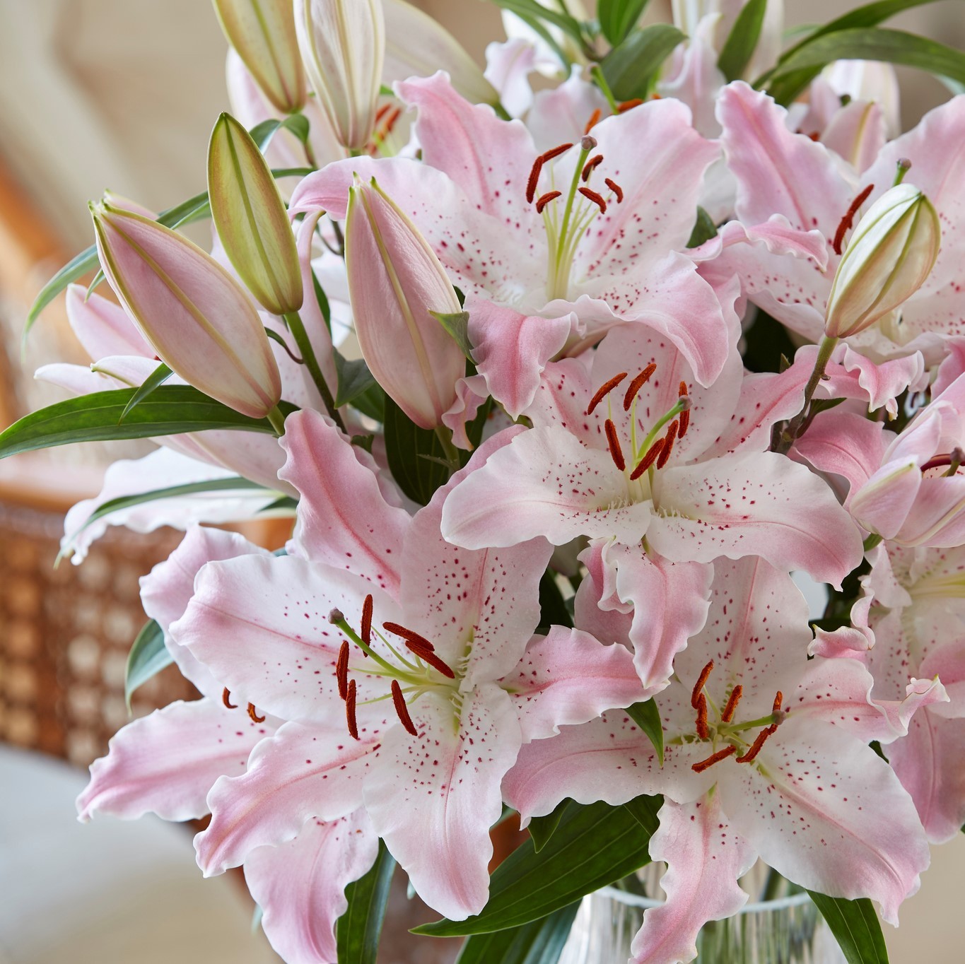 Лилия восточная Виртуозо - очень нежная лилия с перламутровыми лепестками и насыщенным ароматом. Белоснежные лепестки с розоватыми кончиками и бордовым крапом переливаются на солнце. Беспроблемный и обильноцветущий сорт.
