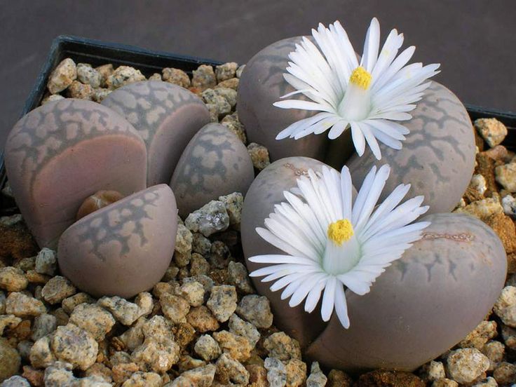 Литопс Marmorata - экзотическое цветущее растение. Диаметр пары листьев 1-2 см. Верхняя поверхность листьев серо-зеленая, с более темным мраморным рисунком. Цветки 3-5 см в диаметре, белые, с приятным запахом. Лепестки тонкие и длинные.