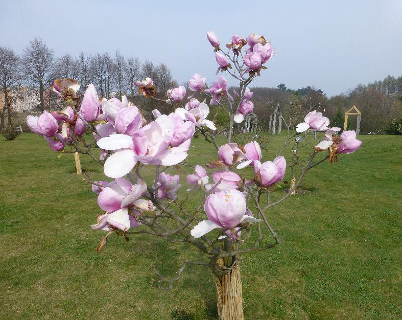 Магнолия Alexandrina - листопадный кустарник или небольшое дерево. Во взрослом воздасте достигает до 8 м высотой и 4-6м шириной (в южных регионах). Цветки крупные, бокаловидные, до 15 см, у некоторых садовых форм до 25 см в диаметре, с тонким ароматом или без запаха. Цветки темно-пурпуровые снаружи и белые внутри. Цветение обильно до распускания листьев, либо одновременно с их появлением. Цветёт сорт в мае на протяжении 2-3недель. Плоды — розовато-пурпуровые, сборные листовки. Семена чёрные, в ярко-оранжевой маслянистой оболочке созревают в конце сентября. Листья обратнояйцевидные, около 15 см в длину. Ярко-зеленая листва в осеннее время года желтеет.
