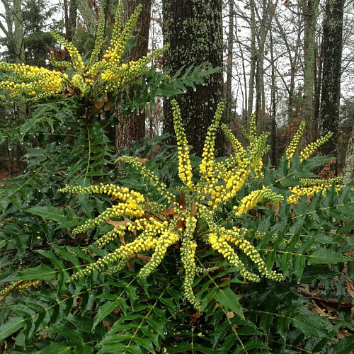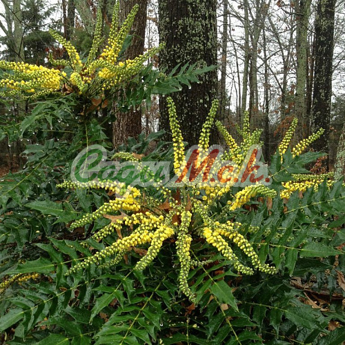 Магония Winter Sun - вечнозелёный вертикально растущий, слаборазветвлённый кустарник с толстыми скелетными ветвями. Высота 1,5-1,8 (до 2,5) м, при мягком климате выше. Листья расположены очерёдно, непарноперистые, состоят из 21 листочка, узко яйцевидные, длиной 10 см, острозубчатые, сверху зелёные, снизу светлее. Осенняя окраска старых листьев жёлто-оранжево-красная. Зацветает очень рано, в марте-апреле. Жёлтые ароматные цветки собраны в пучки и поникающие соцветия длиной 20-30 см. Основные корни глубокие. Плодородные, гумусные, свежие, рыхлые, равномерно увлажнённые почвы, от кислых до слабощелочных.