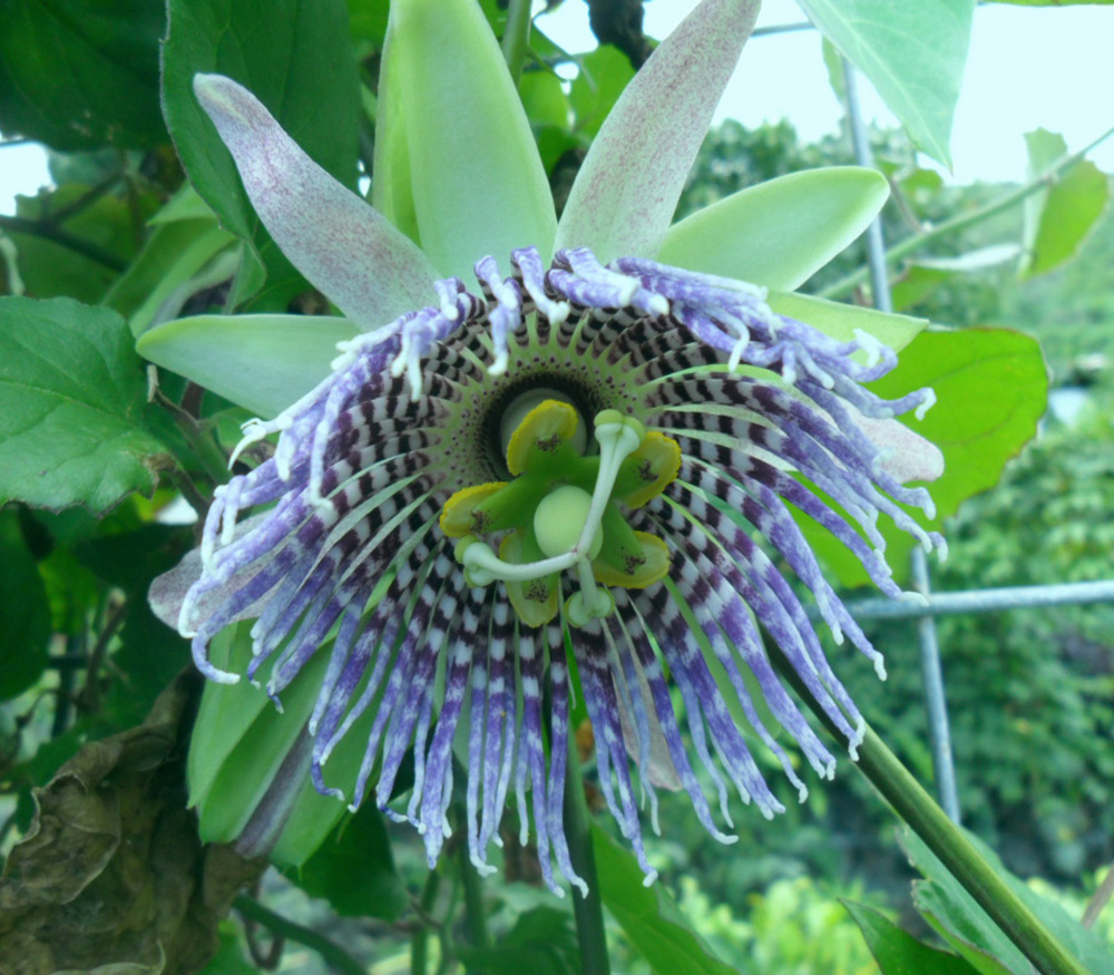 Маракуйя Purple Granadilla - цветущая все лето быстрорастущая субтропическая лиана. Листья светло-зеленые, цельные. Цветки нежные, белые со светло-фиолетовыми оттенками, переходящие в фиолетовый цвет у основания. Плоды сливовидной формы, темно-синие с фиолетовыми оттенками. Мякоть съедобная, сочная, сладкая.