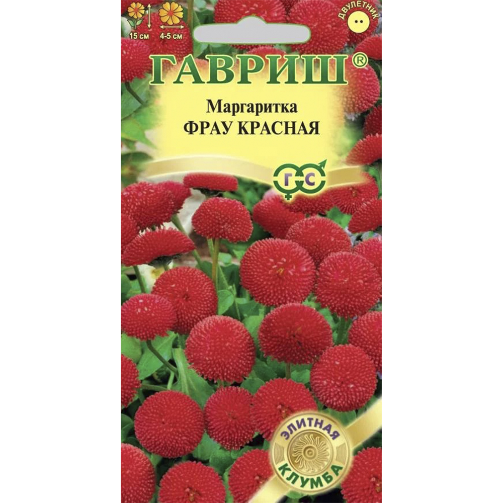 Маргаритки группы сортов «Фрау» обладательницы крупных, плотных как помпоны махровых соцветий, диаметром 4-5 см. Кусты прочные пышные, одинакового размера, высотой 15 см, в пору цветения, обильно усыпаны красно-малиновыми соцветиями. Серия успешно используется в профессиональном и любительском садоводстве для выращивания на клумбах, рабатках, в бордюрах, а также в горшках и балконных ящиках. Маргаритка неприхотливое многолетнее растение, культивируемое как двулетнее. Предпочитает солнечные места без застоя воды. Хорошо переносит легкое затенение. Недостаток влаги в период цветения может привести к измельчению и полному исчезновению соцветий. Семена высевают в открытый грунт в конце июня — начале июля, всходы появляются через 7-10 дней. Цветение начинается в апреле на второй год после посева. При хорошем уходе растение цветет до осени, с перерывом в жаркий период сезона.