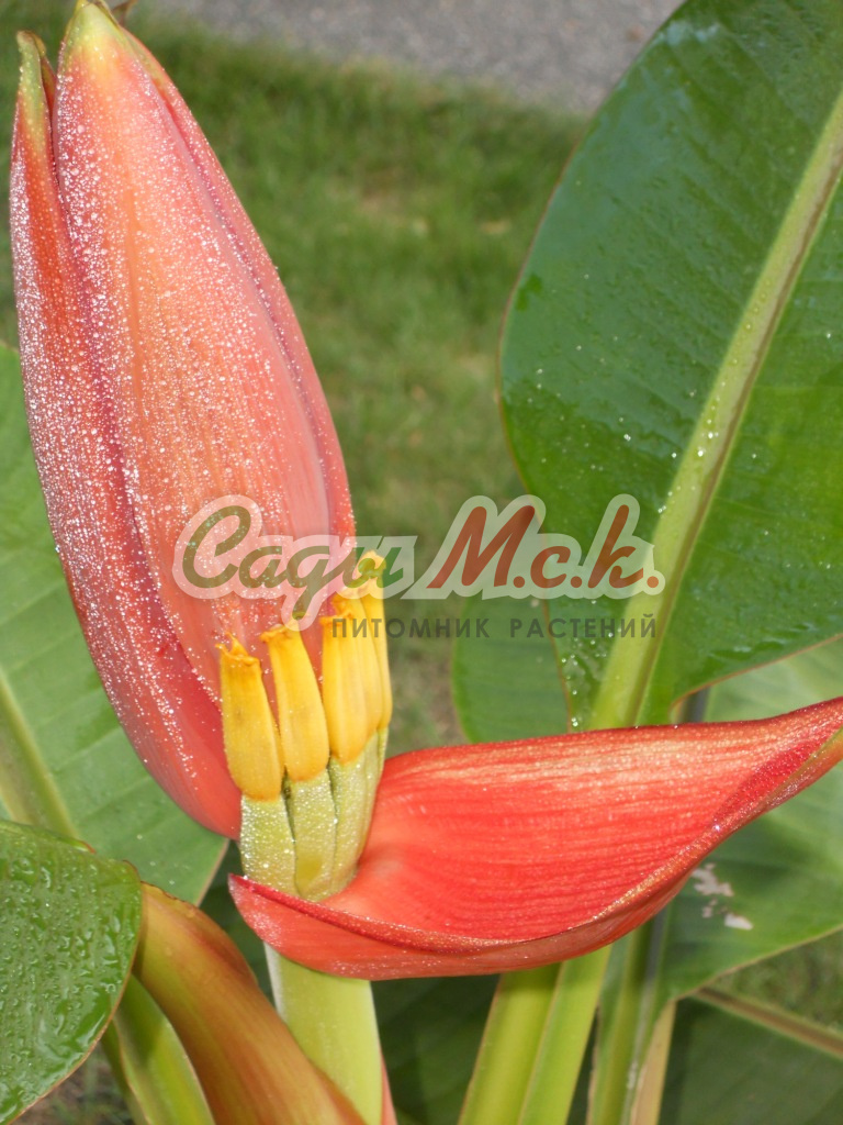 Musa ornata Orange Flower - низкорослый плодовый цветущий банан высотой до 3-х метров. Листья декоративные, крупные, зеленого окраса с фиолетовым жилкованием. Цветки желтые, прицветники красно-оранжевые, огромные. Плоды темно-розового или кремового окраса.