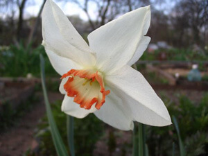 Нарцисс Audubon - диаметр цветка 10 см. Доли околоцветника зеленовато-белые. Коронка как бы трехцветная: внутри коронка ярко-желтая, ближе к краю — светло-желтая, край коронки ярко-оранжево-розовый. Сочетание окрасок создает необыкновенно яркий, нежный, изумительной красоты цветок. Диаметр коронки 3,6 см, высота — 1,5 см. Цветонос до 40 см. Срок цветения средне-поздний.