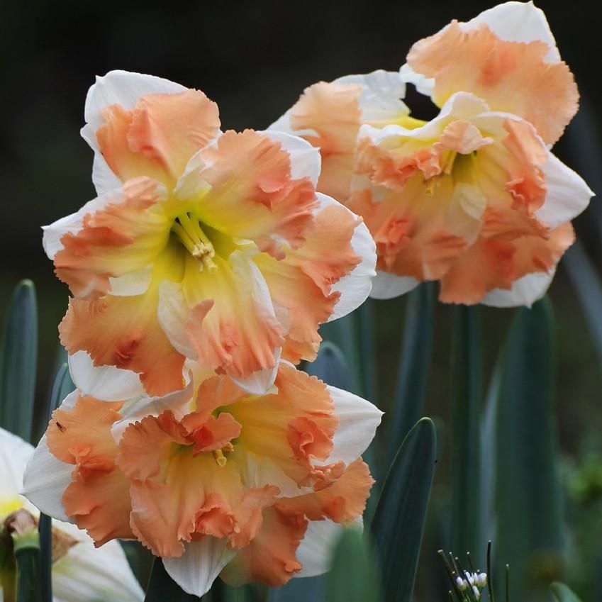 Нарцисс с расщеплённой коронкой Кум Лауде - раннецветущий, многолетний сорт. Нарциссы - культура более теневыносливая по сравнению, например, с тюльпанами, но на освещенных местах цветение значительно выше, чем в тени. Цветки с приятным ароматом, крупного размера, одиночные. Цветок белый с нежно-розовой коронкой, ярко-оранжевой по краю, гофрированной. Нарцисс Кум Лауде неприхотливое в выращивании растение, стебель прямостоячий, крепкий. Нарциссы пользуются особой популярностью в декоративном садоводстве, их выращивают в открытом грунте на клумбах.
