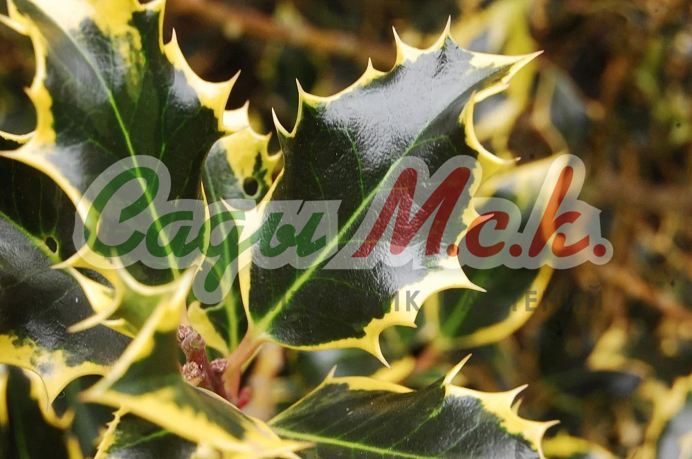 Листья очерёдные кожистые, эллиптические или яйцевидные, тёмно-зелёные с желтой каймой блестящие (глянцевые) на верхней стороне и светло-зелёные на нижней, 5-12 см длиной и 2-6 см шириной. Края листьев зазубренные и волнисто-изогнутые.