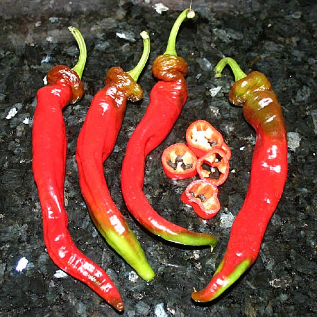 Среднеострый урожайный сорт из Индии. Плоды удлиненные, хоботообразные, слегка изогнутые. В технической спелости зелёные, в биологической - ярко-красные.