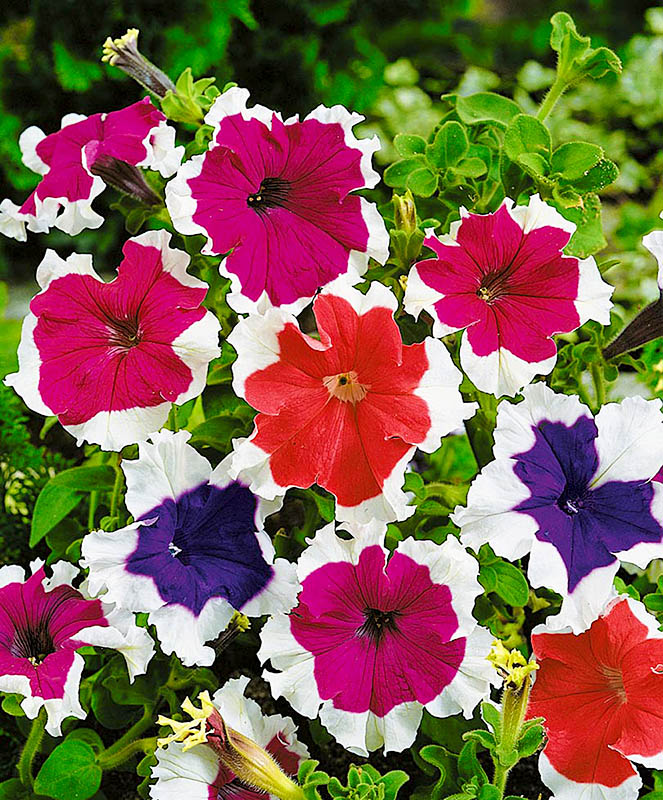 Традиционная ранняя крупноцветковая смесь. На компактном кустике распускаются в большом количестве упругие цветки диаметром 6-8 см разнообразных окрасок, с белой полосой по краю. Выращивают рассадным способом. Посев проводят с января по апрель, поверхностно, под стекло (после появления всходов стекло убирают). В зимние месяцы январь-февраль досветка обязательна. При ранних сроках посева цветение начинается в мае, что очень удобно для выращивания растений на балконе, закрытых террасах, патио. Без дополнительного освещения петунию высевают не раньше марта. Всходы появляются через 7-12 дней. На постоянное место высаживают, когда минует опасность заморозков. Светолюбива и достаточно засухоустойчива. Предпочитает легкие, плодородные, хорошо дренированные почвы. Петунии можно выращивать в течение нескольких лет, сохраняя зимой в освещенном помещении (растение сильно обрезают, t не более 12°С, умеренный полив). Прекрасно смотрятся отдельные растения петунии, высаженные в группе, образуют яркое, нарядное пятно, великолепно украсят балконные ящики, вазы и подвесные кашпо.